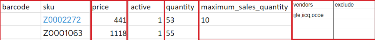 vendors- in this column you can add all vendors (stores in the chain) you want to run this update for separating with comma. If you want to run the update for all vendors, you can simply put ‘all’ in that columnexclude- in order to use this column, you have to put ‘all’ in the column ‘vendors’ and use the column ‘exclude’ for the vendors you want to exclude from the update. Separate the vendors by using commas.