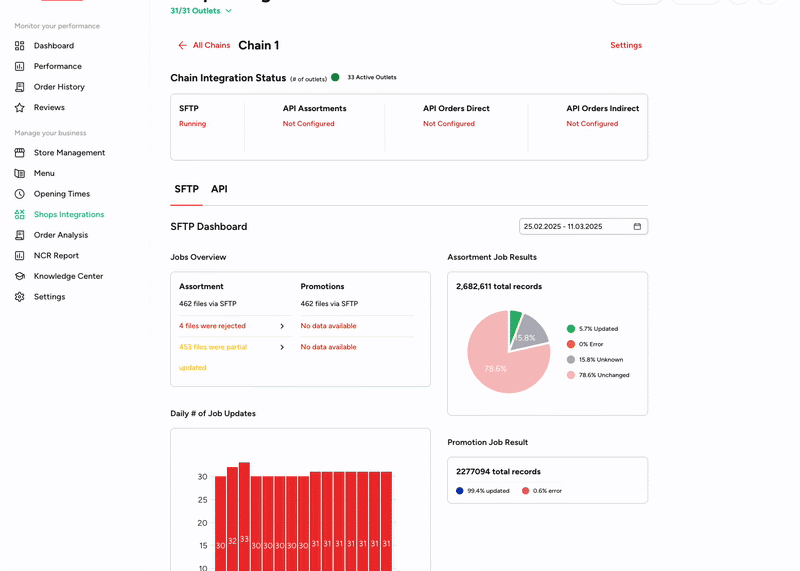 **Assortmentfolder by using the credentials received from your Account Manager. More on this in the Credentials and Access section.**Check the updates in Partner Portal in Shops Integrations Section Under Assortment updates. You can also download the file you have recently uploaded and review the errors if any occurred.