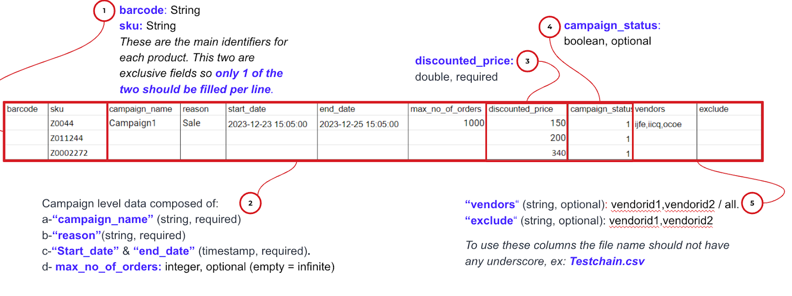 This format is designed to update the assortment and/or promotions for a single vendor or store at a time. However, multiple promotions for the same vendor or store can be included, allowing you to create promotions for different dates within a single file.