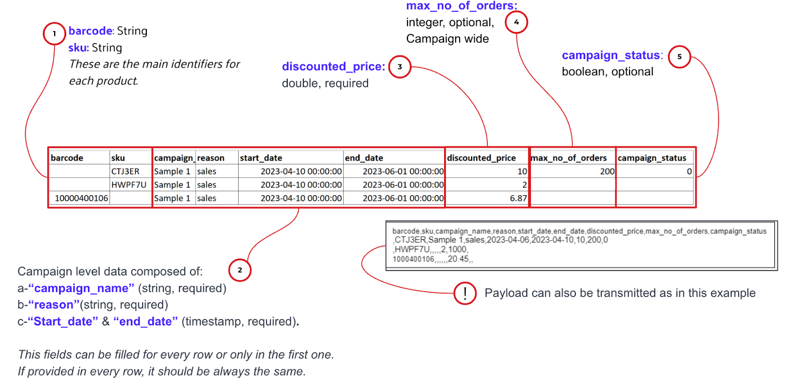 This format allows you to create multiple types of promotions within a single file. For example, if you want to include both a strikethrough promotion and an item bundle promotion in the same file, you can easily do so with this format.