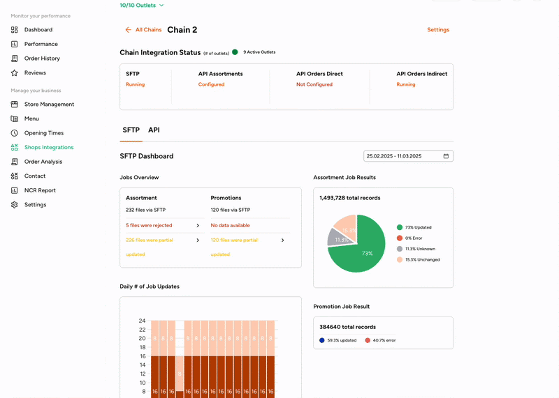 Assortmentfolder by using the credentials received from your Account Manager. More on this in the Credentials and Access Section.Check the updates in Partner Portal in Shops Integrations Section Under Single File updates. You can also download the file you have recently uploaded and review the errors if any occurred.